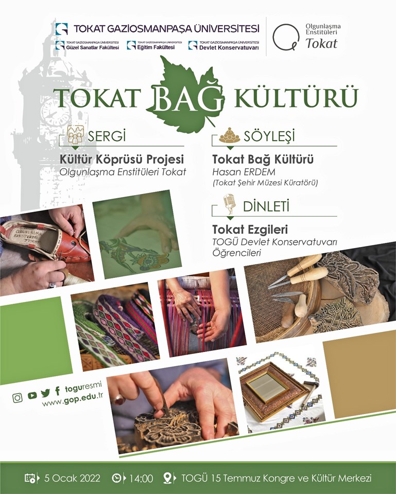 Fakültemiz tarafından, Tokat Olgunlaşma Enstitüsü, TOGÜ Eğitim Fakültesi ve TOGÜ Devlet Konservatuvarı işbirliği ile 05.01.2022 tarihinde Üniversitemizin 15 Temmuz Kongre ve Kültür Merkezi'nde gerçekleştirilecek olan Tokat Bağ Kültürü isimli etkinliğimize tüm öğrencilerimiz ve personelimiz davetlidir.