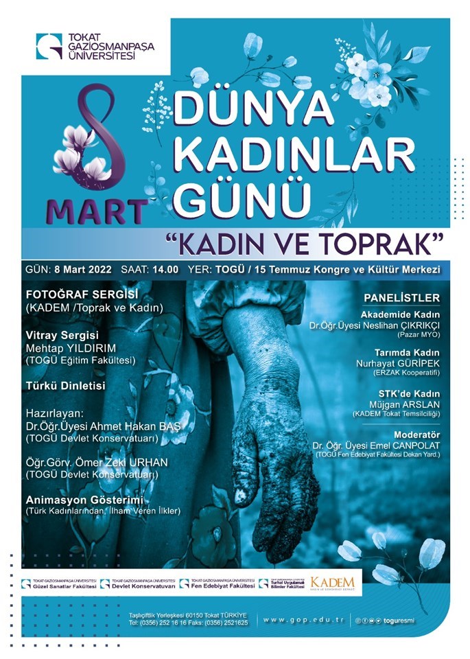 Güzel Sanatlar Fakültemiz, Üniversitemiz Devlet Konservatuvarı, Fen Edebiyat Fakültesi, Turhal Uygulamalı Bilimleri Fakültesi ve KADEM iş birliği ile düzenlenen "Kadın ve Toprak" konulu 8 Mart Dünya Kadınlar Günü etkinliğimiz 15 Temmuz Kongre ve Kültür Merkezi'nde gerçekleştirilecektir. Etkinliğe tüm öğrencilerimiz ile akademik ve idari personelimiz davetlidir.